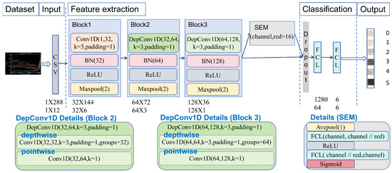 In this work, the extracted spectral data on seed cotton containing foreign fibers were normalized and then fed into the model in one-dimensional CSV format for iterative learning. In the model architecture, Block1 consists of convolution (Conv1D), batch normalization (BN) [30], a nonlinear activation function (ReLU), and the max pooling layer (MaxPool). This combination allows for the extraction of fundamental local features while stabilizing training and accelerating the convergence. Blocks 2 and 3 introduce depthwise separable convolution (DepConv1D), which decomposes the convolution operation into depthwise and pointwise components. This significantly reduces the number of parameters and the amount of computation, making the model more lightweight and faster without compromising accuracy. By integrating BN, ReLU, and MaxPool, these blocks enhance the network’s ability to capture discriminative spectral patterns from the reduced input space. In the process of feature extraction and classification, the SEM is added to enhance the attention towards effective features by adaptively adjusting the feature weights of each channel to extract more useful information, thus improving the classification performance. Before the Fully Connected Layers (FCLs), dropout [31] is used to randomly discard some neurons to prevent overfitting in the neural network while speeding up the training process. Eventually, the network accomplishes the classification task through two FCLs, which output the data as corresponding categories. The model incorporates regularization techniques such as dropout and batch normalization, as well as attention mechanisms (the SE module), to enhance robustness and reduce overfitting, thereby improving its generalization ability across diverse spectral and spatial variations. The overall framework and parameter settings of the proposed architecture are illustrated in Figure 5.
