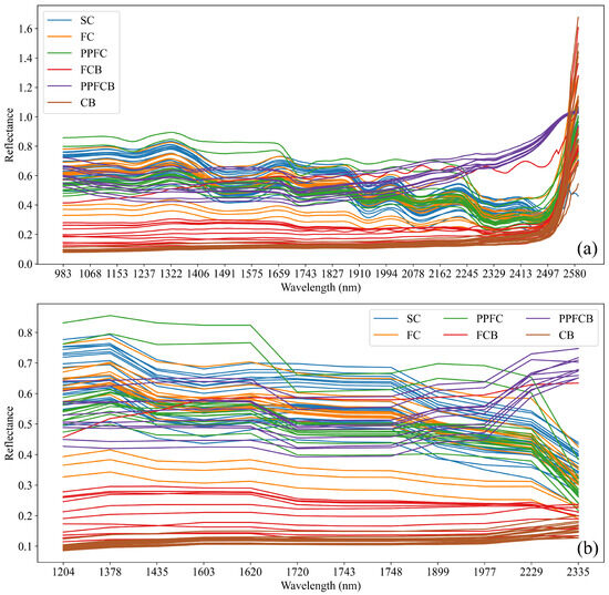 Comparison of raw and HWOO feature-selected seed cotton–foreign fiber spectral data. (a) Raw spectra of seed cotton–foreign fiber spectral data samples. (b) Seed cotton–foreign fiber spectral data samples after HWOO feature selection.