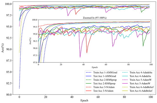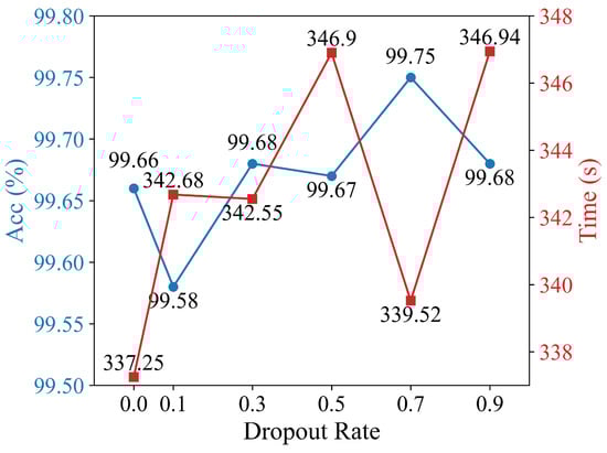 As shown in Figure 7, the classification accuracy and the training time of the model vary significantly under different dropout rates. Under the conditions where the optimizer is AMSGrad [35], the number of training epochs is 100, and the batch size is 64, the test accuracy reaches the highest value of 99.75% when the dropout rate is set to 0.7. In addition, compared to the configuration with the shortest training time, the total training time increases by only about 2 s when the dropout rate is 0.7. The difference in the training time is negligible.