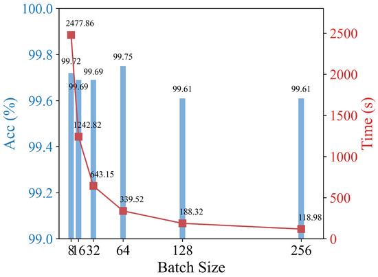 This experiment tested the model performance under different batch sizes (Figure 8). The results show that when the batch size is set to 64, the model achieves the highest classification accuracy of 99.75%, with a training time of 339.52 s, which is relatively fast.