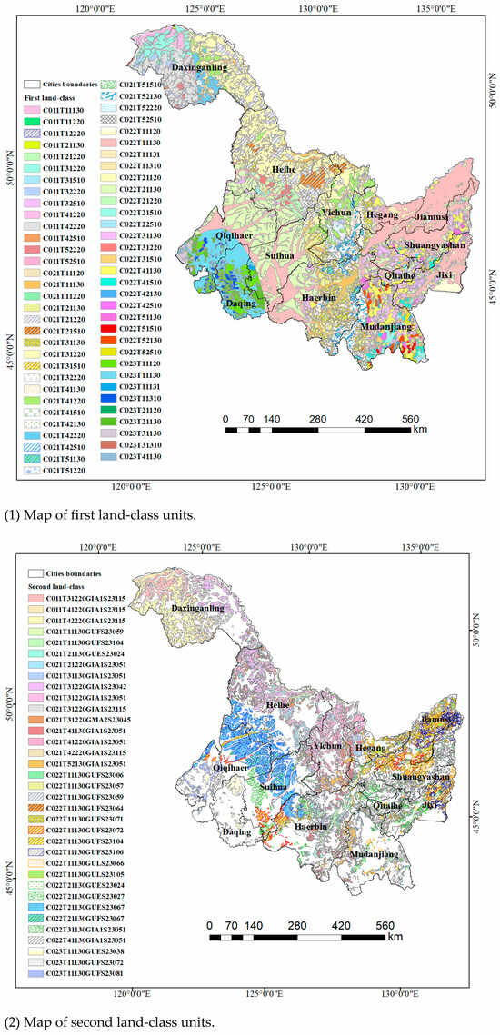 The second land-class land-type units in the plain of Heilongjiang mainly include the alluvial (river deposits) clay meadow soil–medium temperate semi-humid zone uplift/erosion flow low-altitude plain (CO22T11130GUFS23104) and an alluvial sandy gravel bottom calcareous meadow soil–medium temperate semi-humid zone uplift/erosion flow low-altitude plain (CO222T11130GUFS23072), accounting for 2.090% and 1.228% of the area of Heilongjiang, respectively. The former presents a high frequency, as well as a high degree of differentiation and dominance. The land-type units in the hilly and mountainous areas are relatively more fragmented, rich, and complex, mainly including granite sandy dark brown soil–mid-temperate humid zone uplift/erosion periglacial low-altitude hills (CO21T31220GIA1S23051) and granite brown coniferous forest soil–cold temperate humid zone uplift/erosion periglacial small undulating mountains (C011T42220GIA1S23115), accounting for more than 2.000% of the area of Heilongjiang Province. The former has the highest degree of differentiation and the largest diversity index.