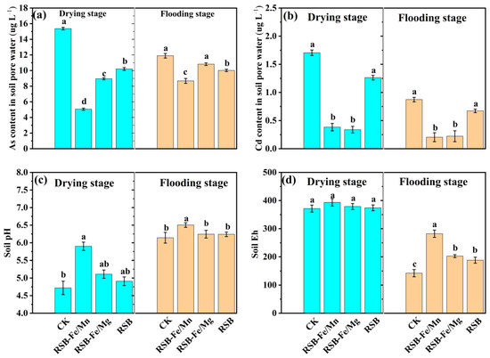 Effect of synthesized materials on (a) Cd and (b) As content in soil pore water and the change in soil (c) pH and (d) Eh during the drying and flooding periods of the incubation experiment. Bars with a different lowercase letter(s) indicate significant differences at p < 0.05 among the treatments.