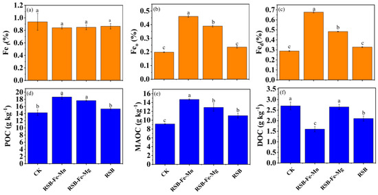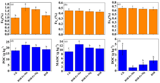 Change in the (a) free Fe oxides (Fef), (b) organic-associated Fe oxides (Feo), and (c) poorly crystallized Fe oxides (Fed) content in soil under RSB-Fe/Mn, RSB-Fe/Mg, and RSB addition during the drying period. Change in different SOC fractions: (d) particulate organic carbon (POC), (e) mineral-associated organic carbon (MAOC), and (f) dissolved organic carbon (DOC) content under RSB-Fe/Mn and RSB-Fe/Mg addition during the drying period. Bars with a different lowercase letter(s) indicate significant differences at p < 0.05 among the treatments.