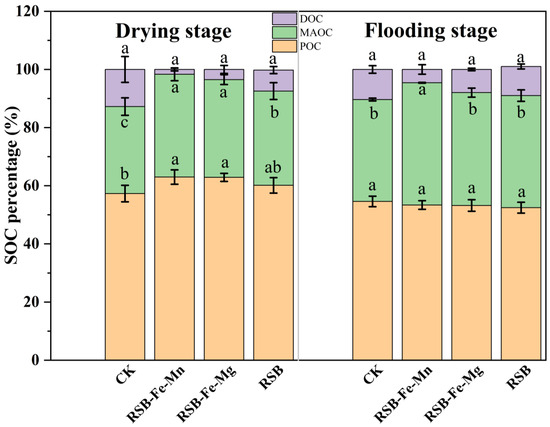 The tendency of the SOC percentage change normalized to 100% during the drying and flooding period. Bars with a different lowercase letter(s) indicate significant differences at p < 0.05 among the treatments.