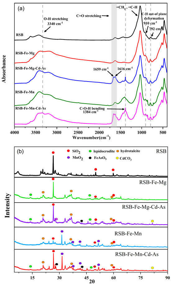 The SEM images in Figure S1 show significant morphological changes in RSB-Fe/Mn and RSB-Fe/Mg compared to the unmodified raw RSB. In Figure S1a,b, the unmodified biochar samples exhibited a relatively smooth surface, where after modification with Fe/Mn (c,d) and Fe/Mg (e,f) oxides, nanoparticles with a size of 10–40 nm or thin flasks with a thickness of ~10 nm were formed on the RSB surface, making a densely covered rough surface, indicating successful impregnation of the Fe, Mn or Mg oxides. Notably, more flasks were formed on RSB-Fe/Mg, while more nanoparticles were found for RSB-Fe/Mn. The FTIR spectra in Figure 6a showed the absorption patterns of different material samples and indicated the presence of various functional groups and chemical interactions. The peak at 1036 cm−1 with strong intensity was attributed to the =C-H and =CH2 bending vibration of the carbon skeleton of RSB. The 910 and 792 cm−1 peaks corresponded to aromatic CH out-of-plane vibrations. The bands between 1600 and 1670 cm−1 belonged to C=O stretching vibration; after As and Cd adsorption, it can be seen that a new peak appeared at 1659 cm−1 beside the original peak at 1616 cm−1, indicating that carboxyl or ester groups were involved in the As and Cd adsorption. The C-O-H bending vibration at 1384 cm−1 increased after As and Cd adsorption on RSB-Fe/Mn and RSB-Fe/Mg. Furthermore, the O-H stretching vibration was observed at 3340 cm−1, increasing after Cd and As adsorption.