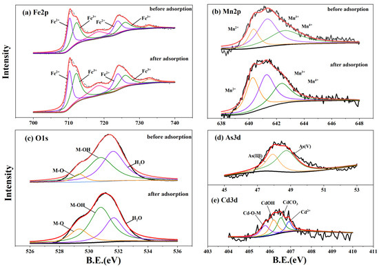 XPS spectra analysis of RSB-Fe/Mn material before and after Cd and As adsorption: (a) Fe2p, (b) Mn2p, (c) O1s, and (e) Cd3d, (d) As3d spectra for RSB-Fe/Mn after Cd and As adsorption. For (a–e): The black curve is the measured curve; The red line is the fitted curve; The blue, green, orange, and purple lines are the subtitles of the respective peaks.