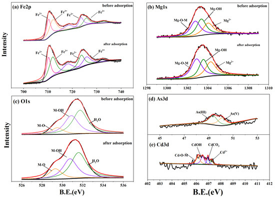 XPS spectra analysis of RSB-Fe/Mg material before and after Cd and As adsorption: (a) Fe2p, (b) Mg1s, (c) O1s, (d) As3d, and (e) Cd3d, spectra for RSB-Fe/Mn after Cd and As adsorption. For (a–e): The black curve is the measured curve; The red line is the fitted curve; The blue, green, orange, and purple lines are the subtitles of the respective peaks.