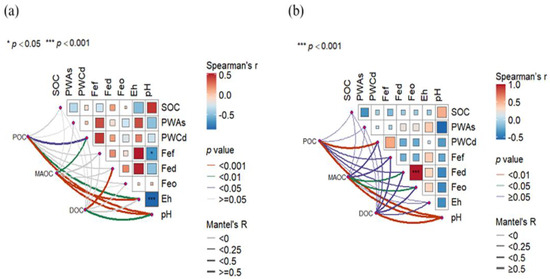 The correlation analysis between soil properties and the Mantel test results for DOC, MAOC, and POC in the drying and flooding phases is shown in Figure 9. In the drying period, significant positive correlations were found between Free Fe and PWAs/PWCd (Spearman’s r > 0.5, p < 0.01). Free Fe was negatively correlated with soil pH due to the introduction of free Fe ions with RSB-Fe/Mg and RSB-Fe/Mn addition. SOC adversely correlated with PWAs, meaning improving SOC benefits the soil as passivation. For SOC fractions, it can be seen that MAOC was correlated with PWCd, and pH/Eh was an important factor influencing POC, MAOC, and DOC. MAOC and DOC showed a higher correlation with Fed and Feo in the flooding period. MAOC also exhibited higher correlations with PWCd; however, no SOC fractions showed significance with PWAs. pH still claims to be the main reason for POC, MAOC, and DOC change. pH also showed a higher negative correlation with Fed and Feo, consistent with the Fe oxide transformation into Fed and Feo during the flooding stage.