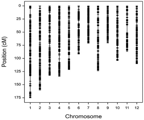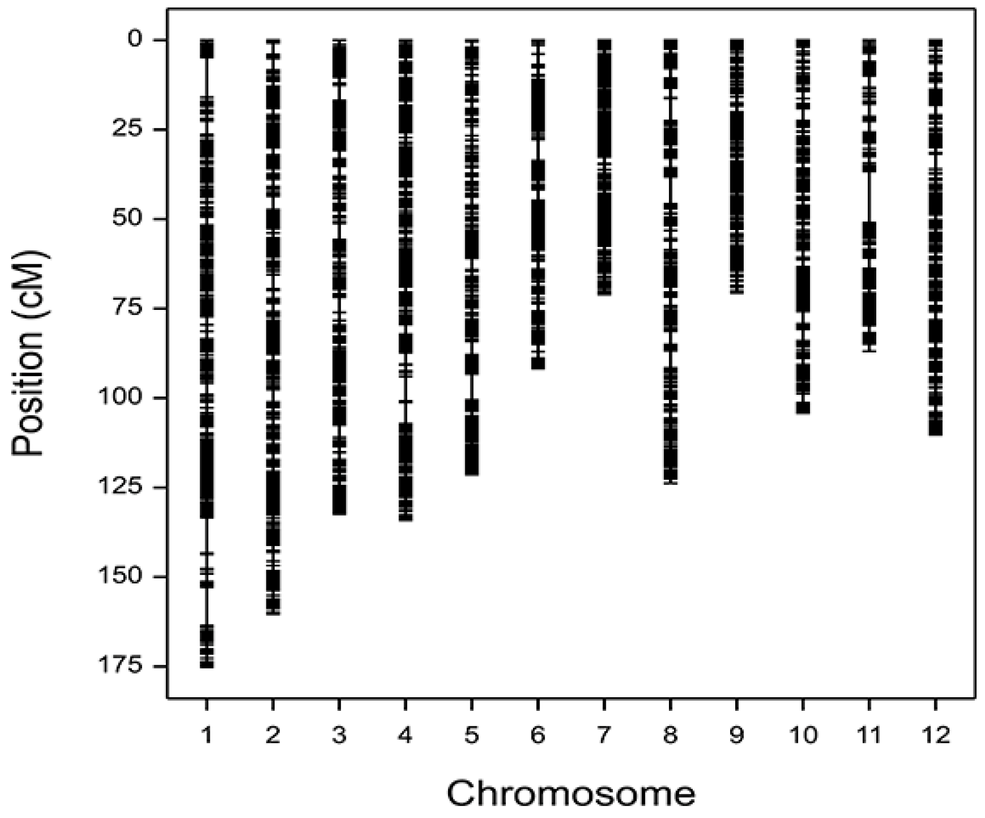 Genetic linkage maps have been constructed in a previous study [24]. Having two parents (9311 and PA64s) that had been sequenced completely, 124 recombinant autogamous singletons (F18 generation) were then sequenced with low coverage and analyzed with recombinant bin. Only one genotype of 9311 or PA64s was present in each recombinant segment. Then, segments with the same genotype were combined into one recombinant bin, resulting in a total of 3524 bins for molecular markers. Finally, a high-density map was then obtained by constructing a genetic map in Mapmaker/EXP3.0 with a total length of 1381.9 cM and an average marker spacing of 0.392 cM. A high-density genotype map was successfully constructed by identifying SNPs and recombination sites using high-throughput resequencing (Figure 1).