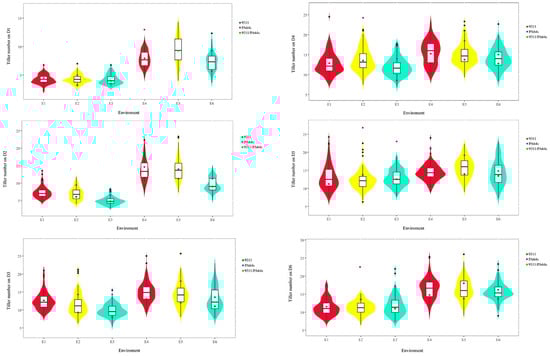 The number of tillers of parents 9311 and PA64s differed in different periods and treatments, except that the number of tillers of PA64s was slightly lower than that of 9311 in E1 and E3 treatments in D1 period, and the number of tillers of PA64s was significantly higher than that of 9311 in the rest of the periods (Table 1). The fastest tiller growth was observed from D1 to D3, and the number of tillers showed a decreasing trend from D5 to D6, which could be attributed to the production of ineffective tillers at the late tillering stage (Figure 2). The most serious stress on tiller number in the three periods of D2, D3, and D4 was caused by the no-N treatment, and the degree of stress gradually decreased. The number of tillers in this environment decreased by 31.5%, 17.2%, and 8% and 30%, 11.3%, and 9.9% compared with that in the same period of time under the straw-returned field and the normal N treatments, respectively, and there was no significant difference between the number of tillers under the straw-returned field and the normal N treatments in the respective periods (Table 1). Meanwhile, the violin plots of tiller numbers in the RIL population at different periods showed a normal distribution under all three treatments, and all showed superparental segregation (Figure 2), which is suitable for QTL analysis.