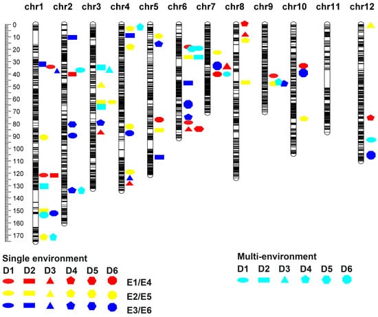 Single-environment QTLs were detected using composite interval mapping (CIM) with a LOD threshold of 3.0 (corresponding to p < 0.01, validated via 1000 permutations). Multi-environment analysis used genome-wide significance (p < 0.05), and FDR correction (Benjamini–Hochberg, q < 0.10) was used to control the false discovery rate.
