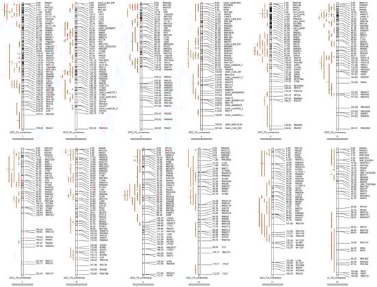 A total of 222 QTLs related to tiller number were collected from 30 reported research populations between 2002 and 2021 (Table 4), and a pre-consensus map covering 12 chromosomes suitable for meta-QTL analyses was constructed by integrating the genetic maps of the studied tiller numbers (Figure 4). The map also had 1865 highly saturated markers with a full length of 2523.2 cM and an average genetic distance of 0.93 to 3.32 cM per marker (Table 5). The highest number of QTLs were localised on chromosomes 1 and 6, with 36 and 37, respectively, and the lowest number of QTLs were localised on chromosome 12, with eight.