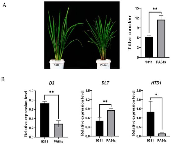 At a tiller number of 6 in 9311 and 11 in PA64s, RNA from parental tiller shoots was extracted (Figure 5A), and the relative expression of some genes related to positive or negative tiller regulation reported by Wang et al. [56] was determined (Table S1). HTD1 [57] and D3 [5] negatively regulated the growth of tiller shoots, and DLT [58] positively regulated the growth of tillers. The results determined in this study showed that the relative expression levels of D3 and HTD1 genes were significantly higher in the parental line 9311 than in PA64s. The relative expression levels of DLT genes were significantly higher in the parental line PA64s than in 9311, and the expression of genes related to the negative regulation of tillering was relatively higher in 9311 than in PA64s (Figure 5B).