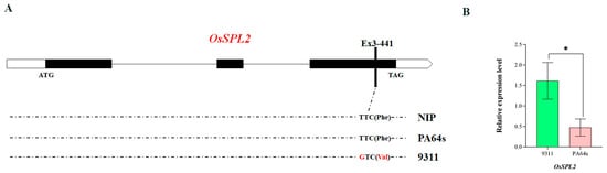 SNPs and relative expression of the OsSPL2 gene in the parental strains. (A): Structure and comparison of the OsSPL2 gene in parental strains PA64s and 9311 and the reference Nipponbare; (B): indicates the expression level of the OsSPL2 gene in different parental strains. *, indicates the significance of the difference in expression levels between PA64s and 9311 at p < 0.05.