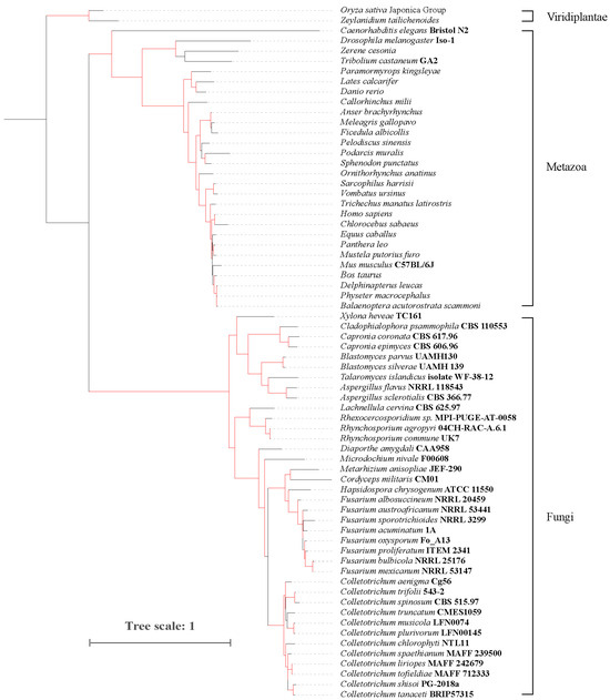 We hypothesized that DNA polymerase theta may be present in fungi, contrary to the previous conclusion [11]. To test this, we selected 68 protein sequences of DNA polymerase theta—comprising 2 from plants, 30 from animals, and 36 from fungi (Table S2)—and constructed a phylogenetic tree (Figure 1). The tree reveals three main clades: one consisting of plant species, one of animal species, and one of fungal species. The fungal clade is more closely related to the animal clade than to the plant clade, consistent with the widely accepted evolutionary relationship among fungi, animals and plants. Within the fungal clade, DNA polymerase theta from Fusarium forms a subclade that groups with sequences from Hapsidospora chrysogenum and is closely related to another subclade containing Metarhizium anisopliae and Cordyceps militaris. Additionally, the DNA polymerase theta from F. acuminatum 1A is most closely related to that of F. sporotrichioides (Figure 1). The bootstrap support values for most branches are above 60%, providing strong statistical confidence in the tree’s structure.