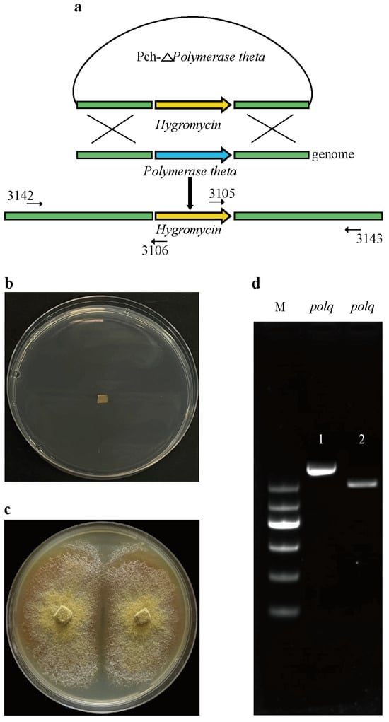To generate the pch-KOpoltheta knockout plasmid, genomic regions flanking the target gene were amplified by PCR using gene-specific primers (listed in Table S1). (The PCR cycling conditions were as follows: 94 °C for 5 min; 94 °C for 30 s; 55 °C for 35 s; 72 °C for 1 min; and 72 °C for 10 min; repeated for 35 cycles.) These included approximately 1.0–1.5 kb of both the upstream (5′) and downstream (3′) sequences surrounding the poltheta gene to ensure homologous recombination. The amplified fragments were cloned into the EcoRI and XbaI restriction sites on either side of the hygromycin B resistance gene within the pch vector. This strategy allowed for the replacement of the native poltheta coding sequence with the resistance cassette through double-crossover recombination.
