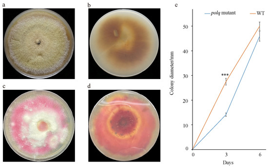 Quantitative analysis revealed that the average mycelial growth rate of the polq mutant was 7.648 ± 0.328 mm/day, compared to 8.325 ± 0.287 mm/day for the wild type (Figure 3e). In addition, on the third day of growth, the colony diameter of the mutant strains was significantly smaller than that of the wild type (p < 0.001) (Figure 3e).