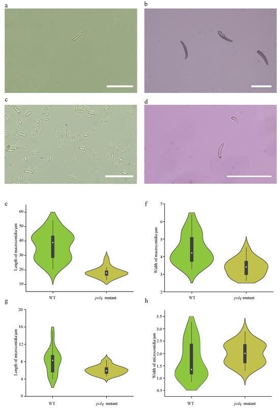 Interestingly, we found that the macroconidia of the polq mutant were slender, transparent, flat-oval, blunt at both ends, and lacked septa (Figure 4a), with dimensions of 13.175–28.247 × 2.636–4.510 µm (mean ± SD = 18.407 ± 3.581 × 3.387 ± 0.495 µm) (Figure 4e,f). The microconidia were kidney-shaped or oval, transparent, tapering gradually at the apex, blunt at the base, and also lacked septa (Figure 4c), with dimensions of 4.637–8.343 × 1.296–2.882 µm (mean ± SD = 6.070 ± 1.017 × 2.002 ± 0.433 µm) (Figure 4g,h). In contrast, the wild-type macroconidia were typically fusiform with 5–7 septa, hook-shaped ends (Figure 4b), and dimensions of 20.709–54.330 × 3.297–6.370 µm (mean ± SD = 36.610 ± 9.418 × 4.416 ± 0.839 µm) (Figure 4e,f). The wild-type microconidia were predominantly fusiform or spindle-shaped, without septa, featuring hook-shaped tops and blunt bases (Figure 4d), with dimensions of 4.019–15.024 × 0.849–3.286 µm (mean ± SD = 8.204 ± 2.889 × 1.727 ± 0.735 µm) (Figure 4g,h).