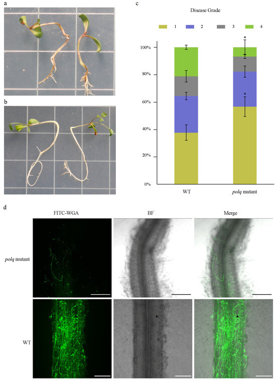 Impact of the absence of the POLQ gene on F. acuminatum 1A virulence. (a) Phenotype of alfalfa inoculated with the wild type. (b) Phenotype of alfalfa inoculated with the polq mutant. (c) Disease severity grades in virulence tests for the wild type and polq mutant. The “*” represents p < 0.05. (d) Confocal microscopy images showing fungal colonization in alfalfa roots with the polq mutant (upper panels) and wild type (lower panels) 48 h post inoculation. Scale bar = 250 µm.