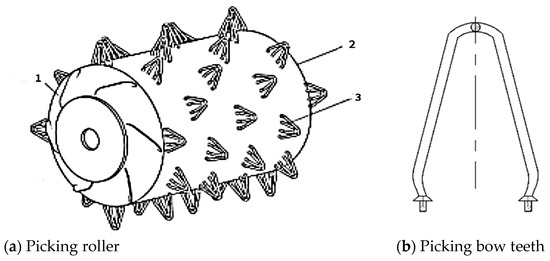 The device mainly consists of a roller, conveyor belt, clamping mechanism, frame, etc. Among these, the core components of the flower-picking mechanism are the picking roller, motor, sliding bearing seat, and so on. The picking roller is the key part that determines the picking performance of the device. Its main structure includes the picking bow teeth, guide plate, and drum, as shown in Figure 2.