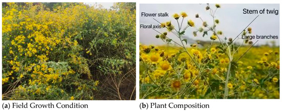 This study was conducted on 2-year-old Chrysanthemum indicum L. from the Bai Ta Village wild chrysanthemum planting base in Qian County, Xianyang City, Shaanxi Province. The plant structure is shown in Figure 3, which mainly includes the flower stalk, flower axis, small branch stems, and large branch stems. The physical parameters of different parts of the plant were measured, and the results are shown in Table 1.