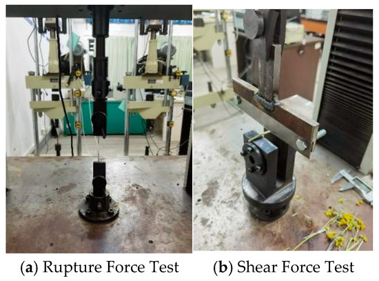 The maximum shear force and rupture force of each part of wild chrysanthemums are the main factors affecting the flower picking performance. As shown in Figure 4, the mechanical parameters of wild chrysanthemums were measured using a universal material testing machine (model DDL10, with an accuracy of 0.015%). During the experiment, the rupture and shear tests were carried out at a speed of 20 mm/min. Ten random samples were selected for each group, and the average maximum shear force and rupture force of each part were recorded, as shown in Table 2.