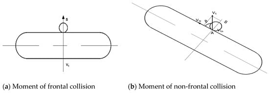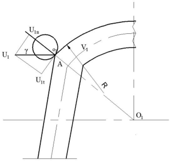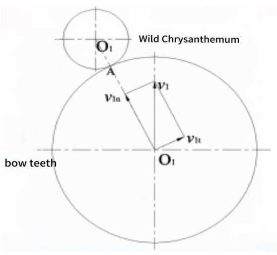 Equation (6) indicates that when the bow teeth are inclined, the critical speed of the roller for causing collision damage increases as the angle β decreases. When the front segment of the bow teeth collides with the wild chrysanthemum, the normal line O1O2 forms an angle γ with the velocity v1, as shown in Figure 7: