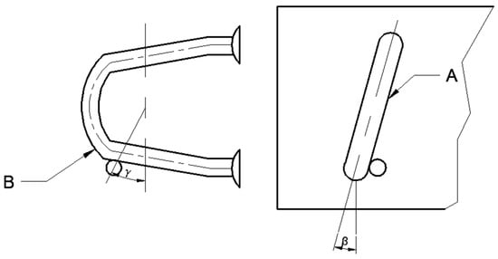 When the front part of the bow teeth collides with the wild chrysanthemum, frontal collisions are rare. Most collisions involve the bow teeth’s front end (B) and the horizontal section (A) with the flower stem, resulting in non-normal collision angles α, β, and γ, as shown in Figure 8: