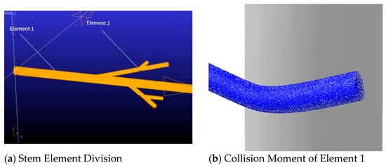 The modal neutral file was exported with the default damping ratio. In ADAMS, a rigid tine model was created, and the mnf file output from ANSYS was imported to generate a flexible wild chrysanthemum stem model. The stem was analyzed as two separate elements, as shown in Figure 9.