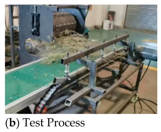 To verify the feasibility of the simulation data for the wild chrysanthemum-picking device, and to identify and solve potential issues, the bench test aimed to validate the optimal roller speed and clamping conveyor belt speed determined during the simulation-based flower picking process [23]. The goal is to achieve maximum flower collection while minimizing damage, and based on the issues encountered during the picking process, improvements will be suggested to provide optimization data for the development of the wild chrysanthemum-picking device. The test setup and process are shown in Figure 12.
