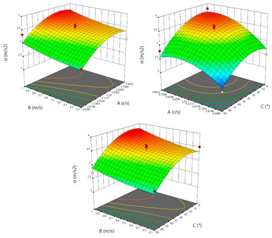 To more clearly analyze the interaction effects of different experimental factors on the critical acceleration as the experimental index, a response surface analysis of the simulation results was conducted using Design-Expert 12.0, as shown in Figure 13.