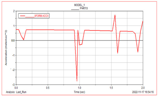 The optimal combination was determined to be a roller rotational speed of 3.8941 r/s and a feeding speed of 0.54 m/s. The corresponding maximum acceleration, as shown in Figure 14, was 3.524 m/s2.