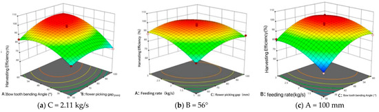 The significant interactions between the bow tooth bending angle, feeding rate, and flower picking gap and their corresponding surface plots for picking efficiency are shown in Figure 15.