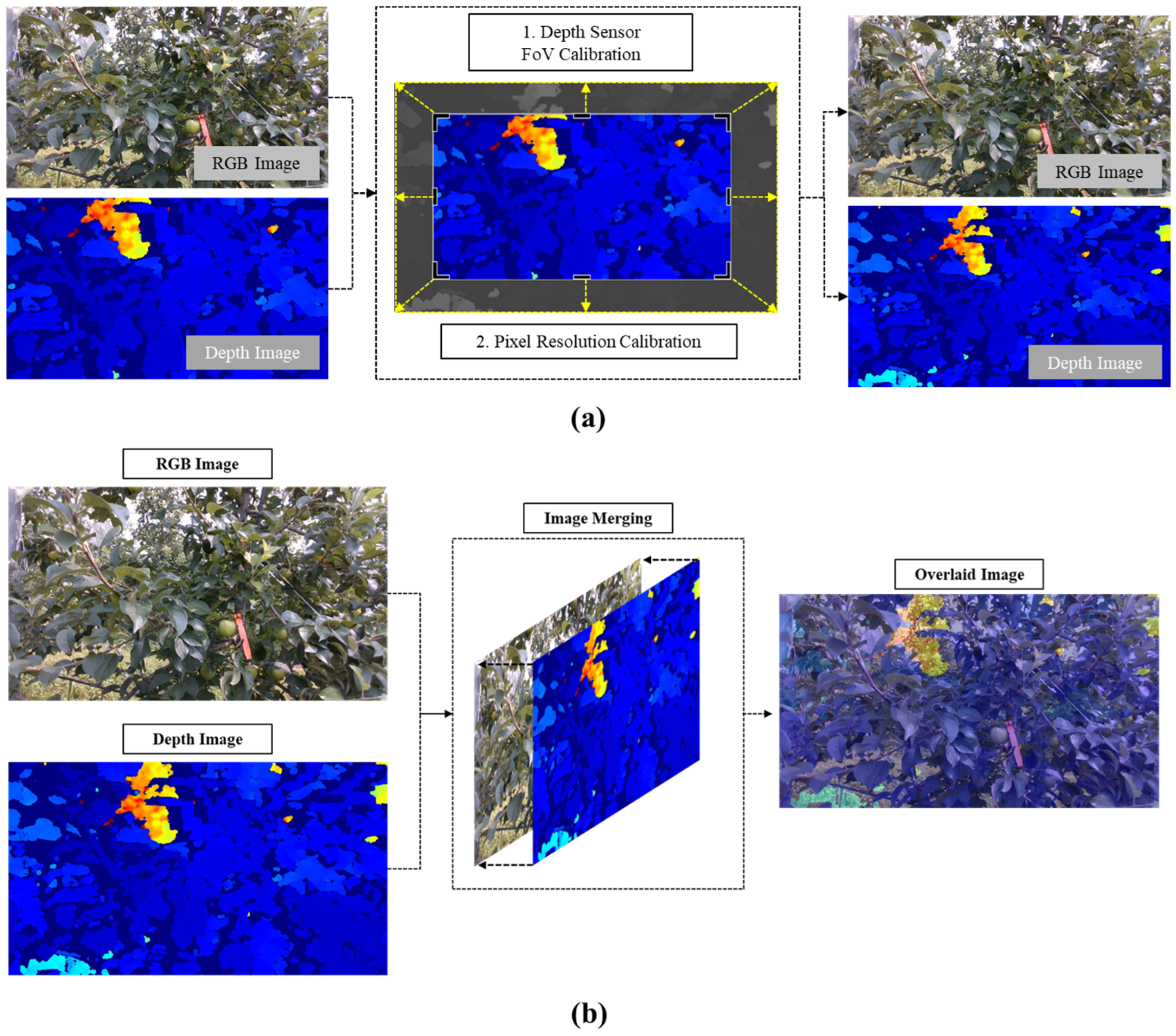 Prior to collecting RGBD images of apples, a calibration process was performed to align the pixel resolution and field-of-view (FoV) between the RGB sensor and 3D depth sensor. The original pixel resolutions of the RGB and 3D depth sensors were 1920 × 1080 and 1280 × 720, respectively, with field-of-view angles of 69.4° × 42.5° × 77° (±3°) and 86° × 57° (±3°), respectively. Since distance information from the 3D depth image is essential for measuring the morphometric information of detected apples, a calibration process was conducted as shown in
