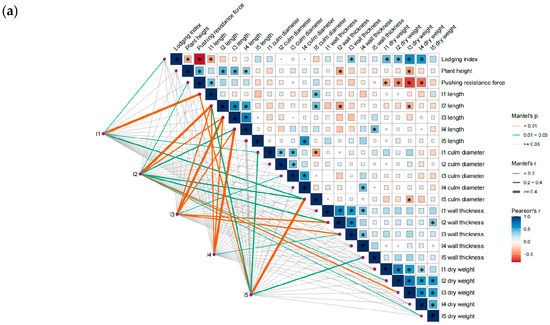 A correlation analysis. Relationships between different internodes (a) and between different index values (b). The thickness of the line represents the degree of significance of the correlation, with a thicker line representing a more significant correlation. Green line (0.01 < p value < 0.05); orange line (p value < 0.01). The blue squares indicate positive correlations, and the red squares indicate negative correlations. I1, I2, I3, I4, and I5 denote the first internode, second internode, third internode, fourth internode, and fifth internode, respectively. *: p < 0.05.
