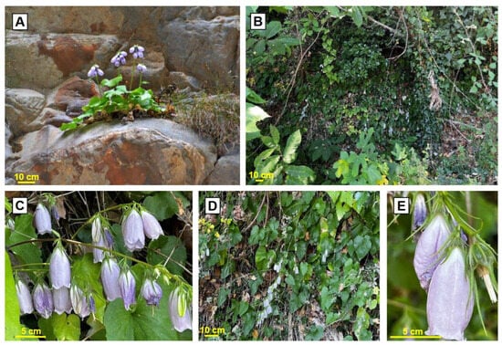 Wild-growing individuals of Campanula cretica in their shady rocky (A) and/or forest (B) natural habitats in the island of Crete, Greece, with vivid green heart-shaped leaves (C) and ascending (A) or pending inflorescences (D) with large showy sympetalous white to deep violet-blue corollas (E).
