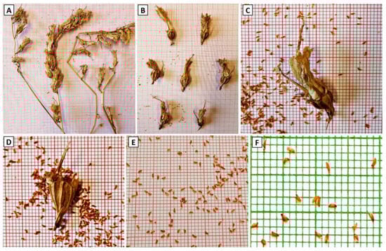 Dried inflorescences of Campanula cretica as collected from the wild habitats (A), separated mature capsules (B), crashed capsule with desiccated corolla before sieving (C), corolla-free capsule ready for final sieving (D), isolated small seeds after sieving (E), and morphology of individual seeds (F).