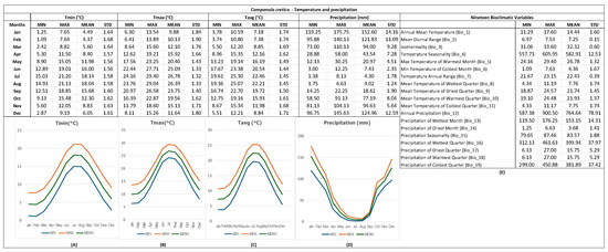 Bioclimatic (ecological) profile across the natural distribution range of Campanula cretica wild-growing populations (n = 8) in Crete, Greece, linked in GIS with geodatabases (WorldClim version 2.1) presenting data for (A) minimum temperatures per month (°C), (B) maximum temperatures per month (°C), (C) average temperatures per month (°C), (D) precipitation per month (mm), and (E) calculated values for 19 bioclimatic variables. For (A–E), the minimum, maximum, average, and standard deviation are displayed based on data from 1970 to 2000. The colors of the plotted lines indicate the minimum (blue), maximum (orange), and mean (green) monthly values for temperature (°C) and precipitation (mm).