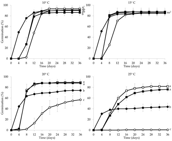 Cumulative germination percentage diagrams of Campanula cretica seeds incubated at 10, 15, 20, and 25 °C without pre-treatment (○) or pretreated with 500 mg·L−1 GA3 (□), 1000 mg·L−1 GA3 (■), and cold stratification (●). 1 In each incubation temperature, the mean final germination percentages were statistically different at p < 0.05 when they did not share a common letter; ns2, mean final germination percentages that were not statistically significantly different (p > 0.05). The comparisons were performed using the LSD test.