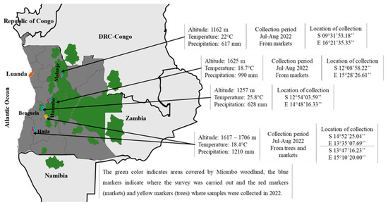 The survey was conducted between July and August 2021. It included 57 open-ended and 12 closed-ended questions on the harvesting period, the quantity of fruit harvested per day, selling price, storage time, monthly consumption, and processed products (full questionnaire given in the Supplementary File). Twelve persons were interviewed in each of the locations chosen, totaling 48 people, randomly selected from the markets, where they had to answer the survey questions orally. These respondents were collectors, sellers, and/or consumers. The locations chosen were Malanje (Chawande market), Huambo (Luvili market), Huíla (Mutundo market), and Benguela (Babaera market) (Figure 1).