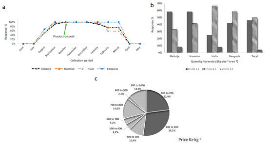 Survey response analysis of harvest and sale of loengo fruit: (a) harvest period; (b) daily quantity of loengo harvested per tree; and (c) average selling price, where Kz (kwanza) or AOA is the currency of Angola. Exchange rate (21/01/2025): 1000 Kz ≡ EUR 1.05.
