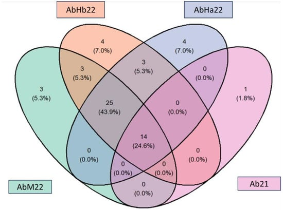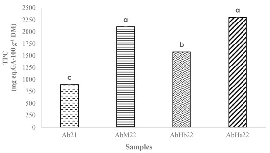 The total polyphenol content was the highest for AbHa22 and AbM22, approaching 2200 mg eq.GA·100 g−1 of DM. The AbHb22 fruits showed an intermediate content (1576 mg eq.GA·100 g−1 of DM), while Ab21 fruits had a significantly lower content, around 900 mg eq.GA·100 g−1 of DM. The highest values obtained corresponded to those reported by Onivogui et al. [29] for fruits of the same genus, A. laurina (2305 mg eq.GA·100 g−1 of DM). In contrast, the content obtained by Lofa et al. [13] in the loengo fruit was 66 times lower (26 mg eq.GA·100 g−1 of DM). As with other compounds, numerous factors can influence the polyphenol content of fruits [43].