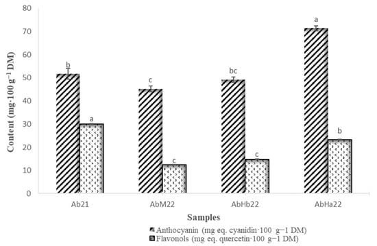 The sample richest in flavonols was Ab21, with 30 mg eq. quercetin·100 g−1 of DM. The fruits with the lowest contents were AbHb22 and AbM22, with contents of around 14 mg eq. quercetin·100 g−1 of DM. In comparison with 17 plum cultivars reported by Liaudanskas et al. [49], with contents ranging from 16.04 to 77.6 mg·100 g−1 of DM, our results were in a similar range. Higher values were found by Mahmood et al. [50] in strawberry cultivars, with concentrations between 112.6 and 128.5 mg·100 g−1 of DM. Although these compounds are only slightly bioavailable [51], they exhibit a variety of biological activities that contribute to the overall health benefits of fruits and vegetables. Polyphenolic compounds act as potent antioxidants and anti-inflammatory agents, contributing to the prevention of chronic diseases such as cardiovascular disease, type 2 diabetes, and certain cancers.