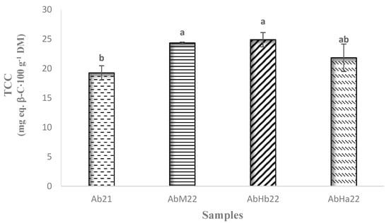 Figure 6 showed that for three out of four samples, the anthocyanin contents were similar—between 45 and 52 mg eq. cyanidin·100 g−1 of DM. However, the AbHa22 fruits were approximately 1.5 times richer in anthocyanins. These contents were lower than those obtained by De Souza et al. [47] in strawberry (Fragaria ananassa Duch.) (219 mg eq. C3G·100 g−1 of DM) and higher than those reported by Onivogui et al. [29] in A. laurina fruit (5 mg·100 g−1 of DM). Our results were also higher than those obtained by Zitouni et al. [48] for strawberry fruits (Arbutus unedo L.), whose contents ranged between 0.15 and 0.64 mg eq. C3G·100 g−1 of DM.