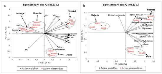 The measured pH values were similar, ranging from 3.1 to 3.3. The highest pH values were obtained in the Ab21 and AbHa22 samples. The TA contents ranged between 1.86 and 2.62 g eq. cit·100 g−1 FM. Statistically, the Ab21 samples were significantly different from the other samples at p < 0.05. These results were slightly higher than those found by Lofa et al. [13] for the same fruit (1.2 g eq. cit·100 g−1 FM). For comparison with a fruit of the same genus A. laurina, Onivogui et al. [29] reported a pH value of 3.09, which was similar to the results obtained in this study, as well as those reported by Lofa et al. [13] for the same species (A. boehmii), which had a pH value of 3.1. The analysis of the organic acid profile revealed two major compounds: citric acid and malic acid. Citric acid was predominant, accounting for 70% w/w of organic acids. The acid contents were highest in AbHa22, followed by AbM22, then Ab21, and lowest in AbHb22. As with sugars, these variations from one sample to another can be explained by a multitude of factors. The measured acid contents were much higher than those reported by Onivogui et al. [29] in the A. laurina fruit, with averages of 9.64 and 0.93 g·100 g−1 of DM for citric and malic acids, respectively, or by Lofa et al. [13] in loengo fruit, with 5.26 and 0.44 g·100 g−1 of DM, respectively.
