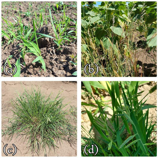 (a) E. villosa seedlings in an infested fallow field; (b) E. villosa tall cluster near senescence within a sunflower crop field; (c) E. villosa cluster surviving in an exposed area, under high levels of heat stress; (d) younger E. villosa cluster near a corn field. Original images were used.