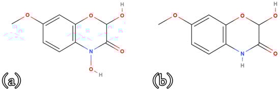 Molecular structures of (a) DIMBOA (2,4-dihydroxy-7-methoxy-1,4-benzoxazin-3-one) and (b) HMBOA (2-hydroxy-7-methoxy-1,4-benzoxazin-3-one). Figures were created with https://www.molview.org.