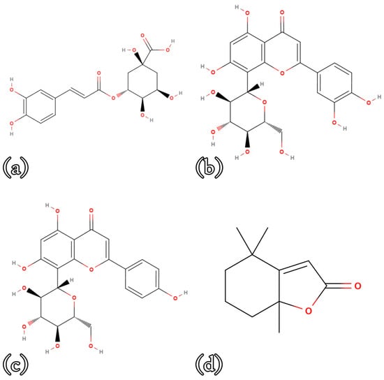 Molecular structures of (a) chlorogenic acid, (b) orientin, (c) vitexin and (d) dihydroactinidiolide. Figures were created with https://www.molview.org.