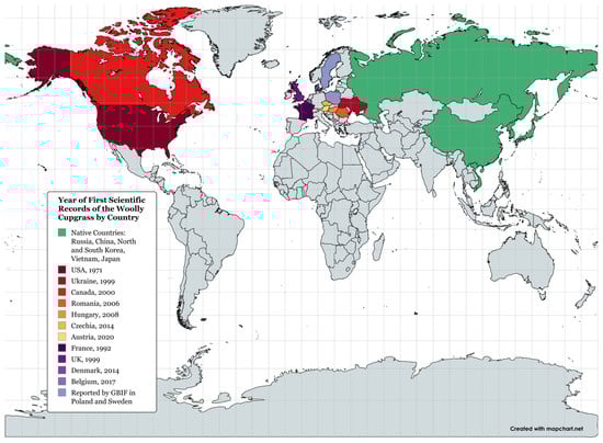 Global distribution of Eriochloa villosa. Although introduction years are in some cases earlier than the years presented in the figure, the years of the first official reports are shown in order to achieve a cohesive visual summary of its spread over time. Native countries are represented in green (China, Russia, South and North Korea, Japan. Reports written in scientific papers are presented in a red to orange gradient (USA, Ukraine, Canada, Romania, Hungary, Czechia, Austria), while reports from atlases and other works are presented in purple hues (France, UK, Denmark, Belgium, Poland and Sweden). N.b.: Darker hues are used to represent older reports of the detection of this species. Figure created with https://www.mapchart.net.