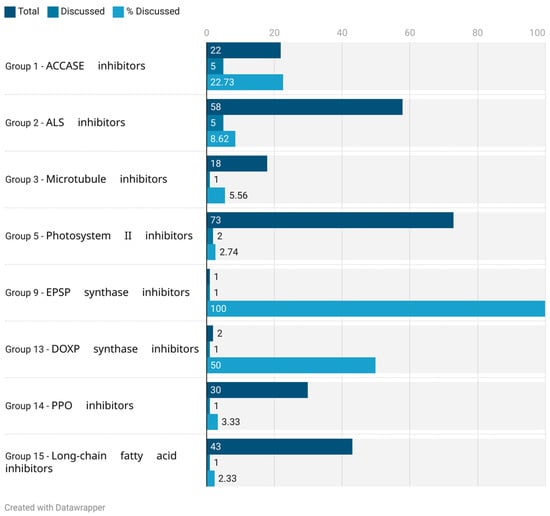Comparison between the total number of herbicidal active ingredients currently approved by the European Union and the number tested against Eriochloa villosa. The percentage of tested substances within each group is also presented. Only groups relevant for this review are included. Group 1—ACCASE inhibitors; Group 2—ALS inhibitors; Group 3—Microtubule inhibitors; Group 5—Photosystem II inhibitors; Group 9—EPSP synthase inhibitors; Group 13—DOXP synthase inhibitors; Group 14—PPO inhibitors; Group 15—Long-chain fatty acid inhibitors. Figure created with datawrapper.de.